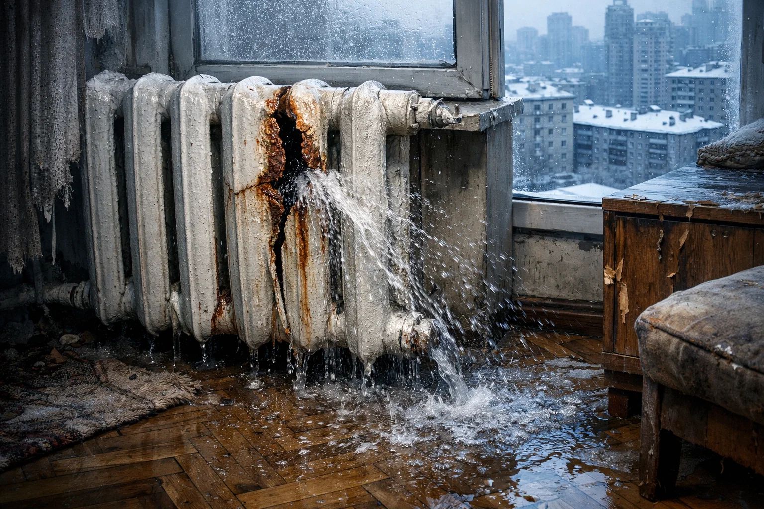 Дело в том, что замерзшая вода расширяется примерно на 9 процентов. Превращаясь в лед, она просто разрывает стальные трубы и чугунные радиаторы изнутри. Представьте стояк многоэтажки, разорванный в десятках мест одновременно. Восстановить такое невозможно — только полная замена.