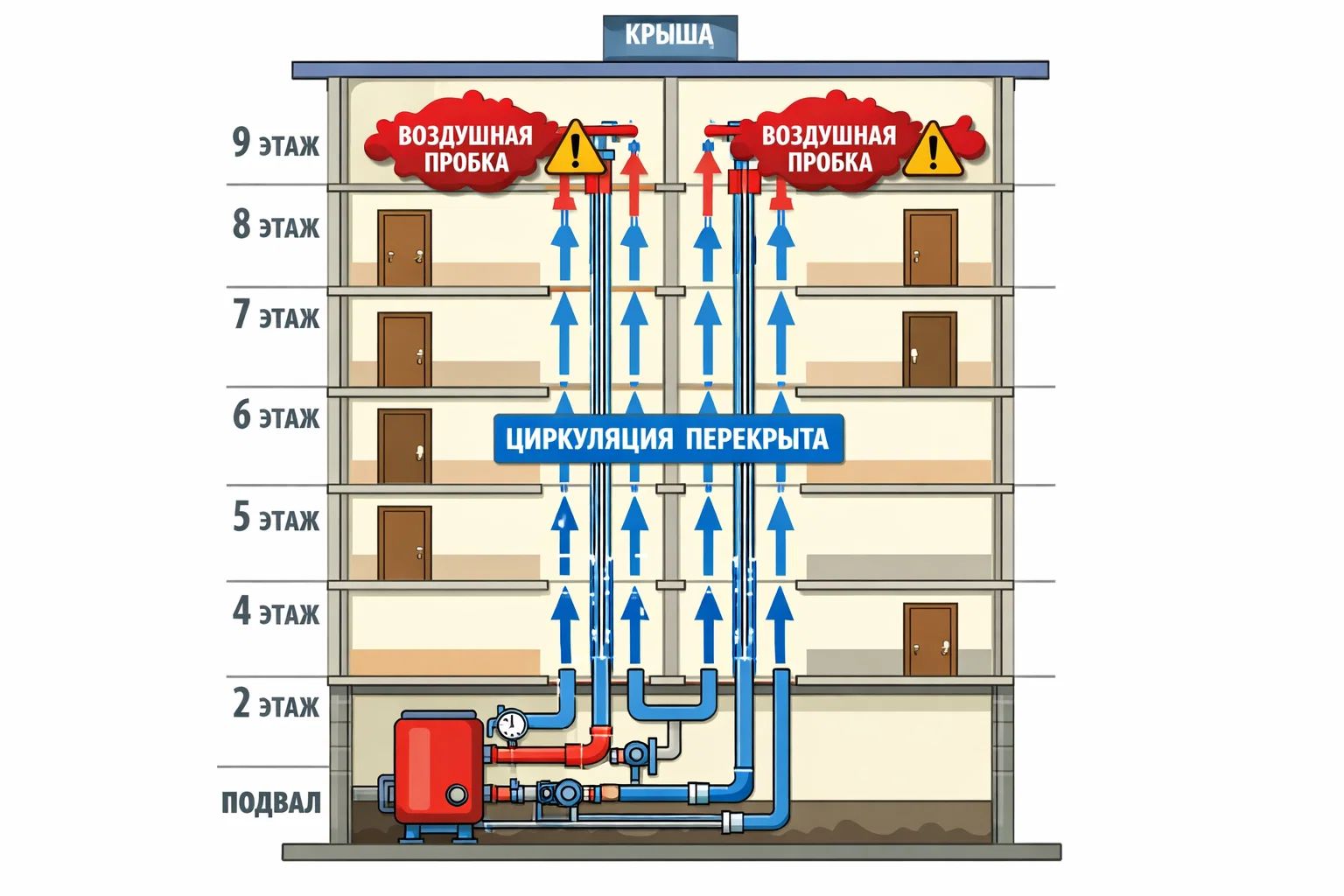 Когда воду начнут заливать обратно, возникнет целый комплекс угроз. Первая — воздушные пробки. Воздух, скопившийся в верхних точках системы, не даст воде циркулировать. Особенно это критично для высотных домов — а в Киеве их большинство.