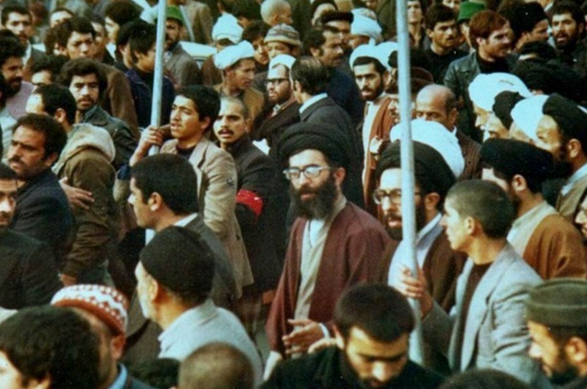 Али Хаменеи (в центре) в ходе массовых выступлений Исламской революции в Иране