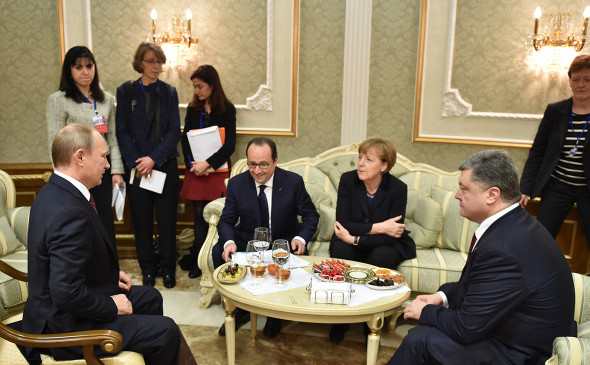 Владимир Путин, президент Франции Франсуа Олланд, канцлер Германии Ангела Меркель и президент Украины Петр Порошенко (слева направо) в Минске, 2015 год