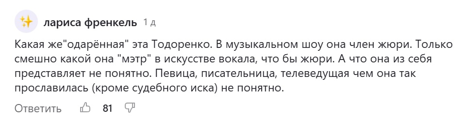 «Какая же «одарённая» эта Тодоренко. В музыкальном шоу она член жюри. Только смешно, какой она «мэтр» в искусстве вокала, чтобы жюри. А что она из себя представляет, не понятно. Певица, писательница, телеведущая, чем она так прославилась (кроме судебного иска) не понятно», - считает Лариса Ф.;