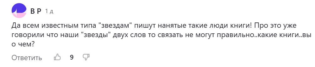 «Да всем известным типа "звездам" пишут нанятые такие люди книги! Про это уже говорили что наши "звезды" двух слов то связать не могут правильно.. какие книги.. вы о чем?», - отметил пользователь под ником В Р.