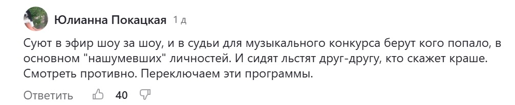 «Суют в эфир шоу за шоу, и в судьи для музыкального конкурса берут кого попало, в основном «нашумевших» личностей. И сидят, льстят друг-другу, кто скажет краше. Смотреть противно. Переключаем эти программы», - написала Юлианна П.;