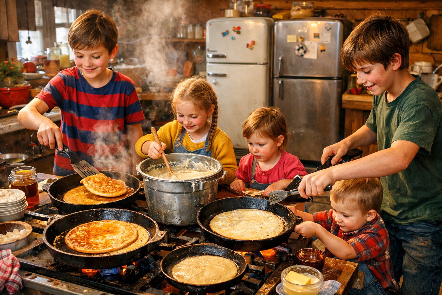 Быт этой семьи поражает воображение. Суп — только десятилитровой кастрюлей. Тесто для блинов замешивали в ведре и пекли сразу на трех сковородах. Пельмени стряпали всем миром — по 500 штук, и это считалось лишь легкой закуской.