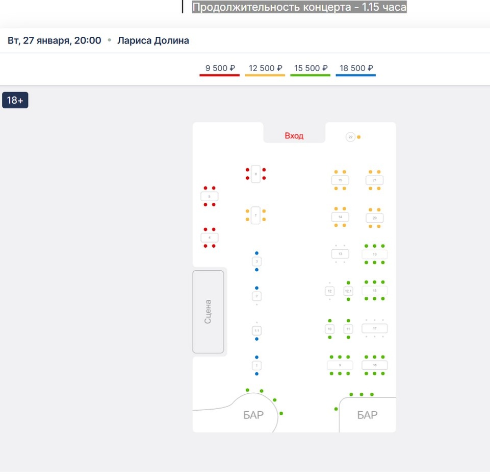 Концерт Долиной 27 января 2026 года в московском баре PETTER. Цветным отмечены не проданные еще по информации на 5 января места за столами, серым — проданные