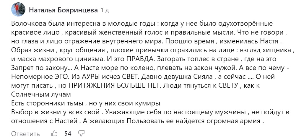 «Волочкова была интересна в молодые годы: когда у нее было одухотворённые красивое лицо, красивый женственный голос и правильные мысли. Что не говори, но глаза и лицо отражение внутреннего мира. Прошло время, изменилась Настя. Образ жизни, круг общения, плохие привычки отразились на лице: взгляд хищника, и маска махрового цинизма. И это ПРАВДА. Загорать топлес в стране, где на это Запрет по закону... А Насте море по колено, плевать на закон чужой. А все почему - Непомерное ЭГО. Из АУРЫ исчез СВЕТ. Давно девушка Сияла, а сейчас .... О ней могут писать, но ПРИТЯЖЕНИЯ БОЛЬШЕ НЕТ. Люди тянутся к СВЕТУ, как к Солнечным лучам. Есть сторонники тьмы, но у них свои кумиры. Выбор в жизни у всех свой . Уважающие себя по настоящему мужчины, не пойдут в отношения с Настей. А желающих Пользовать ее найдется огромная армия», - считает Наталья Б.
