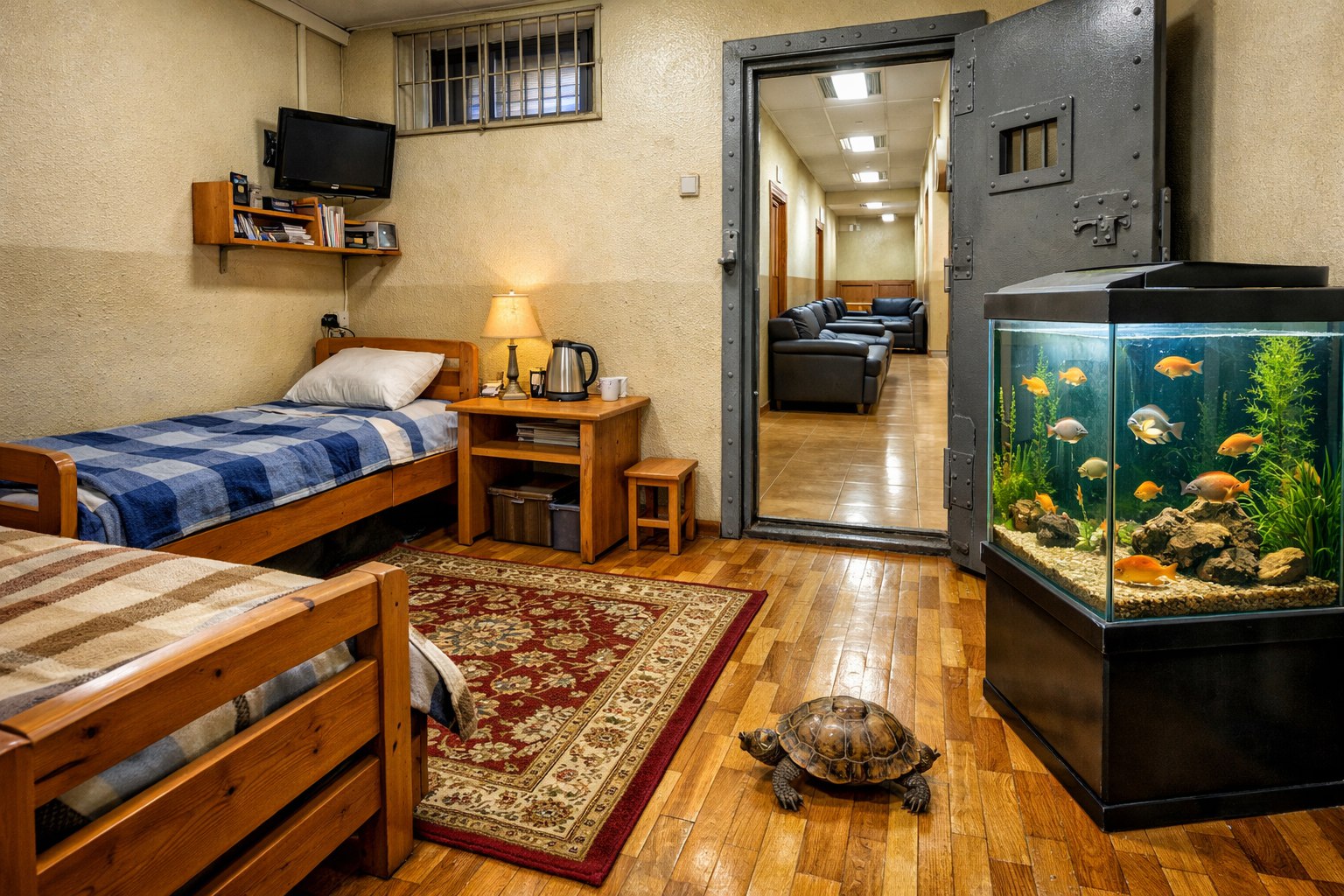 За хорошую работу Косицына через пять лет перевели в блок с облегчённым режимом, который больше походил на вполне себе добротную гостиницу. Судите сами: камеры на двоих или четверых человек, удобные кровати, паркет. В общем коридоре стояли кожаные диваны. Более того, для отдыха заключённых был бильярд и даже зимний сад с попугаями, аквариумными рыбками и даже черепахой. Как вам такое? У большинства и дома таких условий нет.