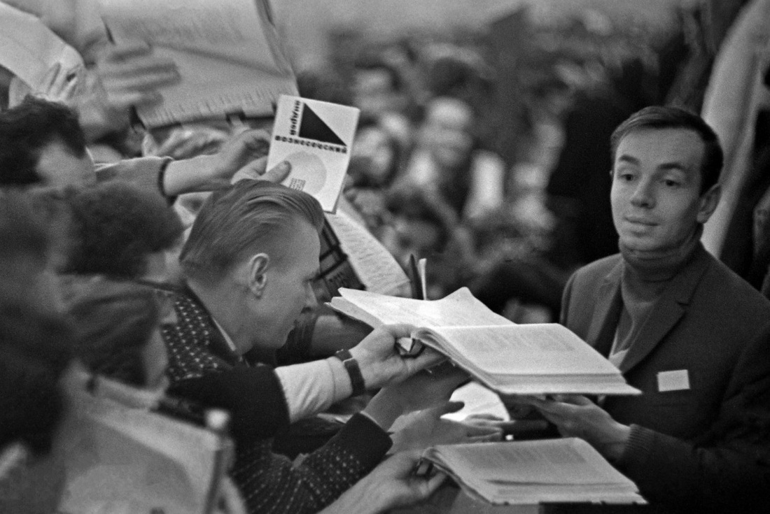 То же самое с Андреем Вознесенским. Он читает в том же году у памятника Маяковскому «Параболическую балладу». Помните: