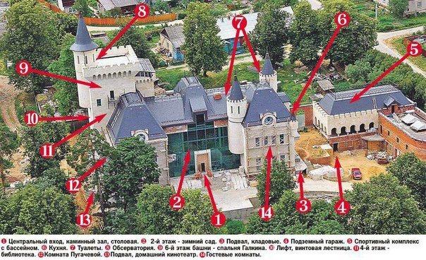 Загородное имение или родовой замок, так звездная чета решила величать свой дом, Пугачева и Галкин возвели в самом «сердце» подмосковной деревни Грязь. Строение, скажем прямо, получилось габаритным: площадью 2300 квадратных метров, шестиэтажное, с подземным гаражом, огромным бассейном и семейным театром со сценой. Для обслуживающего персонала на территории участка в один гектар имеется отдельный домик.