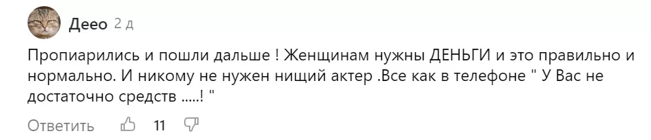 «Пропиарились и пошли дальше! Женщинам нужны ДЕНЬГИ и это правильно и нормально. И никому не нужен нищий актер. Все как в телефоне: «У Вас не достаточно средств .....!», - отметил Деео;