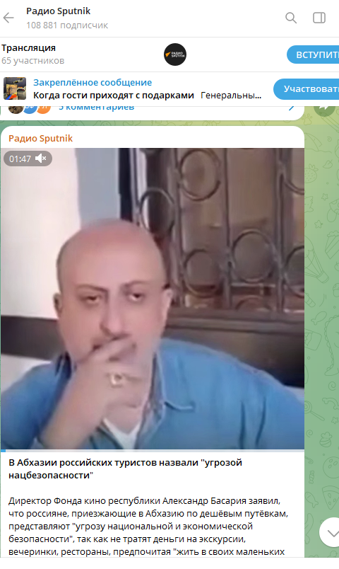 В Абхазии, похоже, с мнением Басарии не согласились, потому что очень скоро Телеграм-канал «Sputnik Абхазия» опубликовал видеозапись с извинениями.