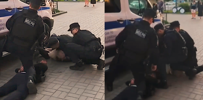 Вызванные прохожими полицейские прибыли оперативно. После неудачных попыток успокоить хулигана словесно они применили силу, уложив его лицом в землю, и надели наручники.