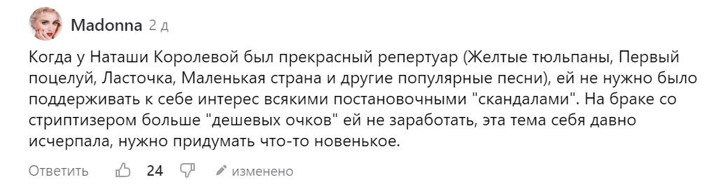 «Когда у Наташи Королевой был прекрасный репертуар (Желтые тюльпаны, Первый поцелуй, Ласточка, Маленькая страна и другие популярные песни), ей не нужно было поддерживать к себе интерес всякими постановочными «скандалами». На браке со стриптизером больше «дешевых очков» ей не заработать, эта тема себя давно исчерпала, нужно придумать что-то новенькое», - отметил пользователь под ником Мадонна;