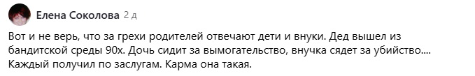 Елена Соколова: «Вот и не верь, что за грехи родителей отвечают дети и внуки. Дед вышел из бандитской среды 90х. Дочь сидит за вымогательство, внучка сядет за убийство.... Каждый получил по заслугам. Карма она такая».