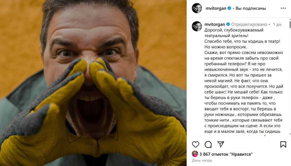 В комментариях к гневному посту Виторгана многие пользователи справедливо заметили, что проблема может быть не в телефонах, а в качестве самого спектакля.