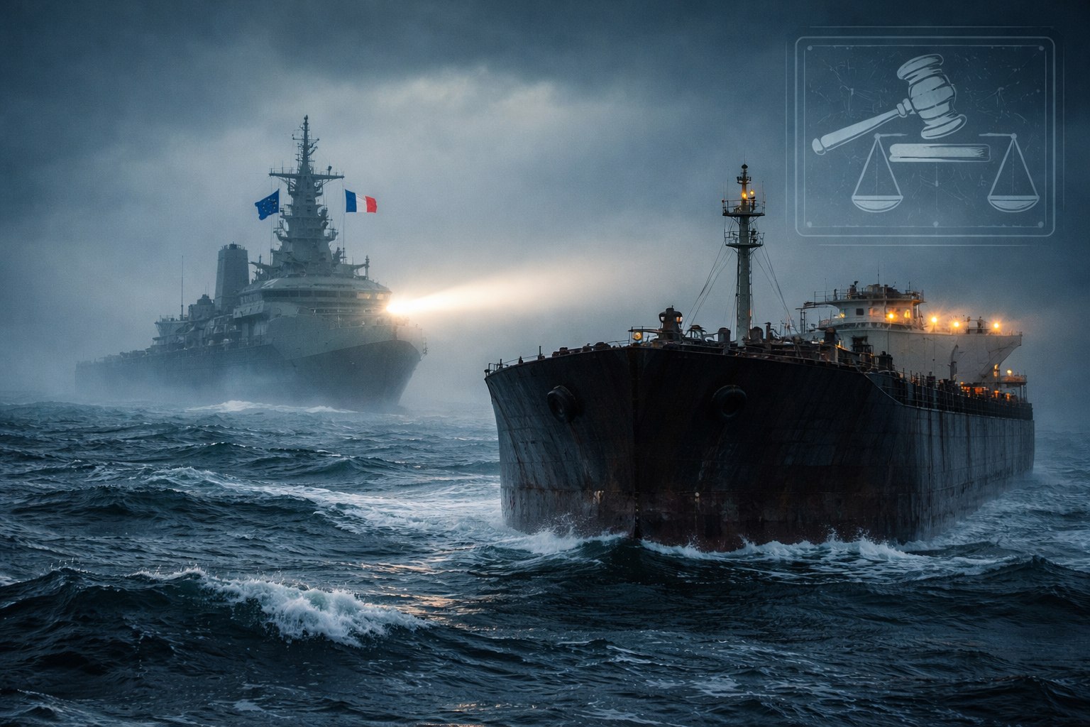 - Первый уровень (национальный, силовой): Французский закон предоставляет конкретные инструменты «полевого» контроля. В территориальных водах военные могут физически остановить, досмотреть и арестовать судно, посадить экипаж или владельца в тюрьму. Это снижает стимулы рисковать заходами в зону ответственности Франции.