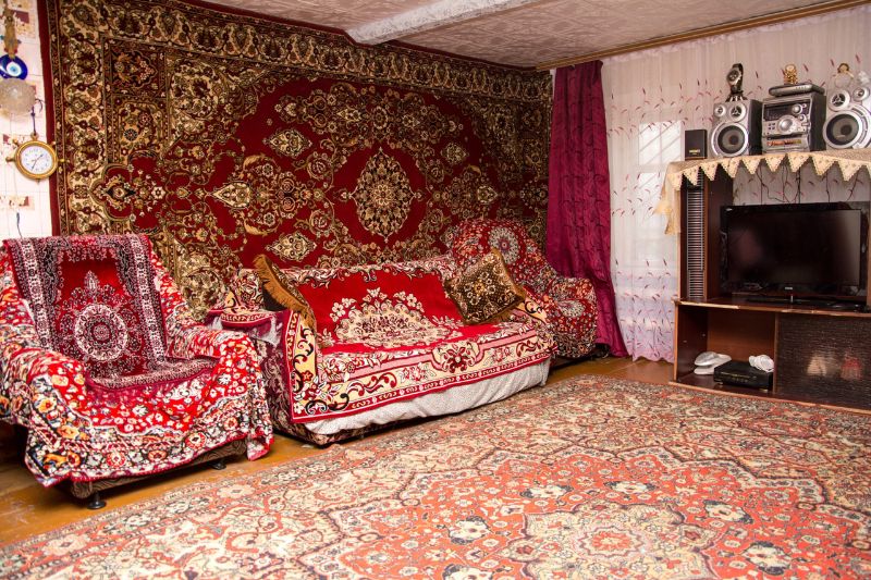 Чаще всего на стенах городских квартир появлялись фабричные ковры с узнаваемым почерком: крупный медальон по центру, растительные или геометрические орнаменты, обязательный бордюр по краям. Цветовая гамма — бордовые, терракотовые, охристые, оливковые тона, которые не спорили с типовой мебелью.
