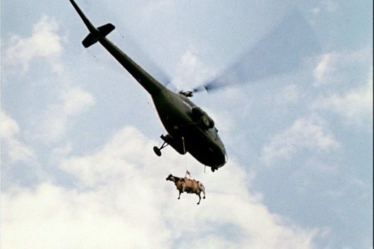 Сцены с летающей коровой могло не быть. Местные летчики отказывались реализовывать задумку режиссера. Тогда тот решил сыграть на профессиональной гордости пилота вертолета и предложил привезти летчика из Москвы, который точно справится. Грузинскому пилоту волей-неволей пришлось отстаивать профессиональную честь. Что и говорить — кадр стал украшением фильма.