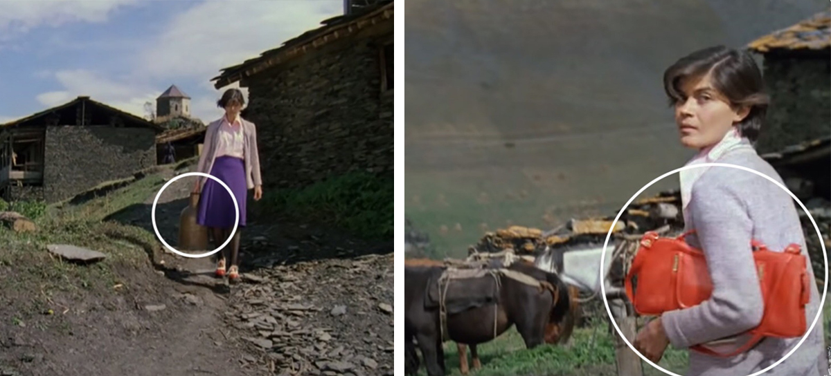 Другой киноляп не заметить сложно, слишком уж яркая деталь закралась в кадр. Идя по поселку, Мимино встречает учительницу Лали. Девушка держит бидон. Она не здоровается с героем, но когда тот делает ей замечание, оборачивается… уже без бидона, зато с яркой красной сумкой.