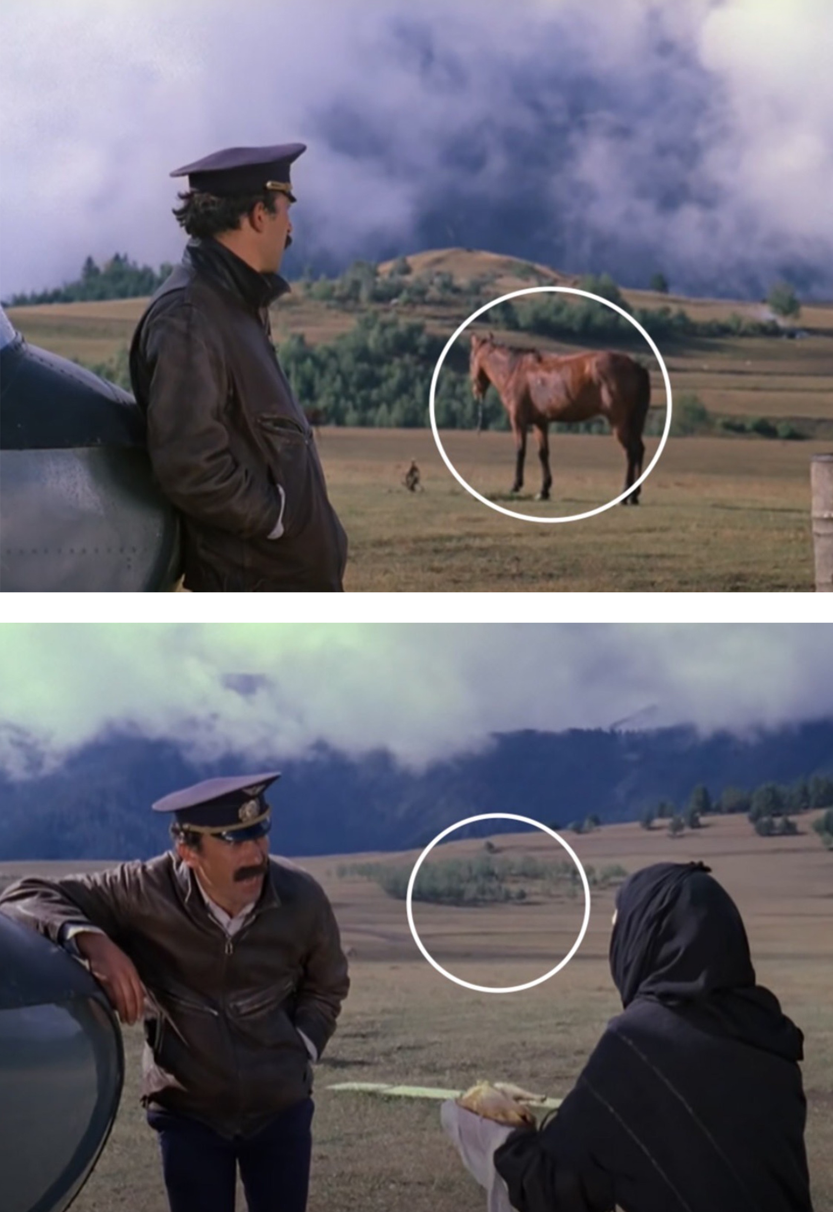 Отсюда и интересный киноляп, который не замечали почти полвека. В одной из сцен Мимино стоит у вертолета, на фоне видна холмистая местность, бочка и пасущийся гнедой конь. К герою подходит жительница села с просьбой перевезти корову на вертолете. Происходит диалог, когда героев показывают крупным планом, а когда план снова становится общим, из кадра исчезает конь вместе с бочкой.
