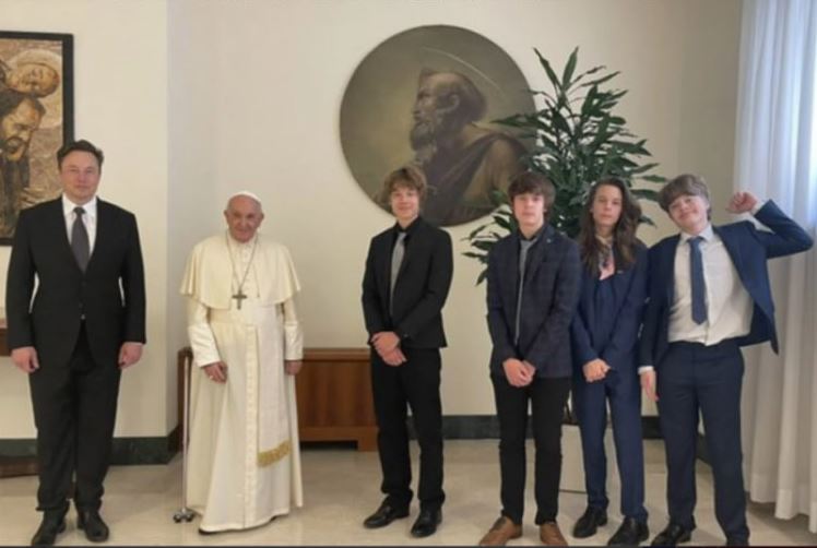 Илон Маск с сыновьями Саксоном, Гриффином, Дамианом и Кайем на аудиенции у Папы Римского Франциска (2022 год)