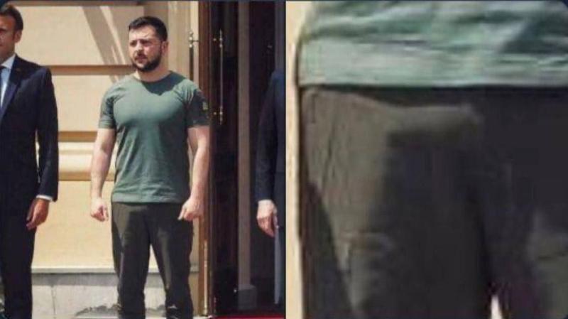 В 2022 году интернет уже бурлил, обсуждая другой инцидент со штанами. Тогда Зеленский встречал Макрона в неформальном военизированном стиле, словно играя роль полководца в дешевом сериале. После эмоциональных объятий с французским коллегой фотографы запечатлели странно топорщившиеся спереди штаны украинского лидера, что вызвало волну догадок, каждая пикантнее предыдущей.