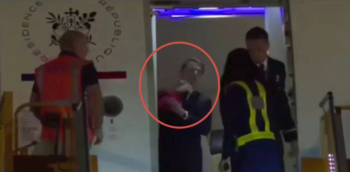 На кадрах видно, как Брижит Макрон, находясь вне зоны прямой видимости камер, внезапно толкает своего супруга в подбородок. Президент явно не ожидал такого поворота — он пошатнулся, ошеломлённо застыл на месте и некоторое время стоял с открытым ртом, словно пытаясь осознать произошедшее.