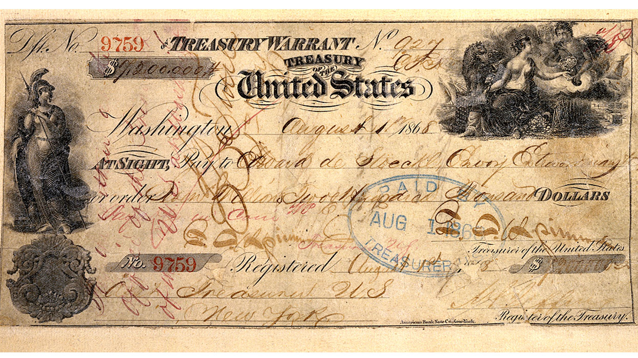 Чек на покупку Аляски, выписанный министерством финансов США на имя российского дипломата Эдуарда Андреевича Стёкля, хранится в Национальном архиве США в Вашингтоне