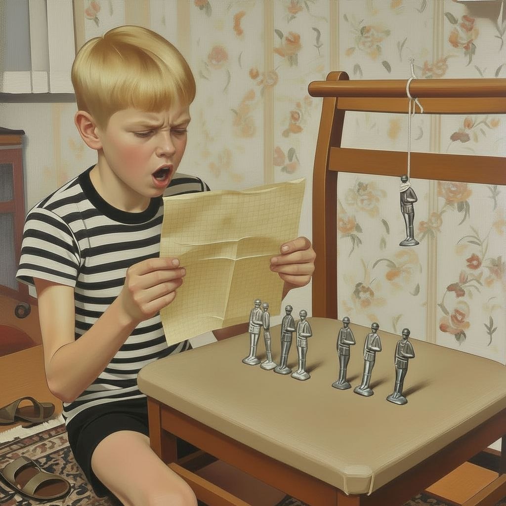 А потом добавил, что из игрушек у него тогда было только несколько оловянных солдатиков. Он их строил на стуле, заранее писал каждому приговор, зачитывал вслух — и вешал одного из солдатиков на нитке.