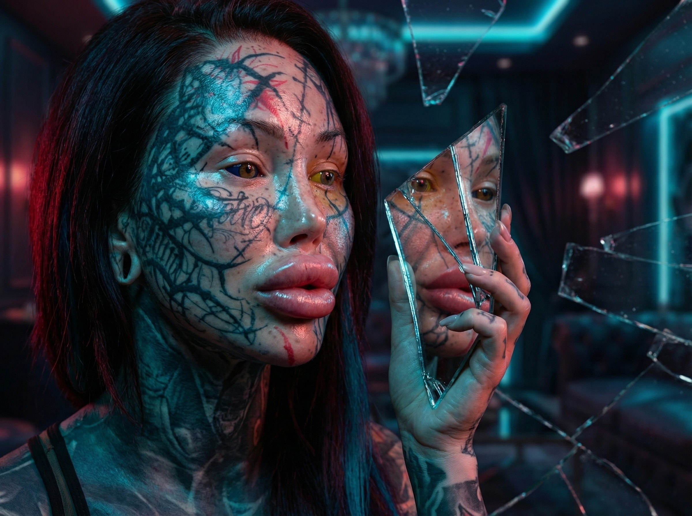 В последние годы трансформации стали совсем пугающими. Мария начала забивать тело татуировками, не жалея даже лицо. Чернила вводились рядом с глазами — риск ослепнуть был колоссальным, но страх стать «обычной» был сильнее страха темноты.