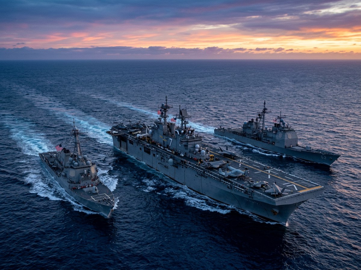 В состав группы входят: сам USS Tripoli, ракетный крейсер USS Robert Smalls и эсминец USS Rafael Peralta. Это не просто корабли — каждый из них несёт систему «Иджис» и способен запускать крылатые ракеты «Томагавк» по целям на суше.