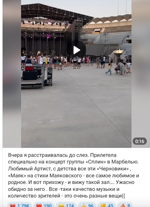 Ярким примером провала стал концерт в испанской Марбелье в июле 2023 года. Арена, рассчитанная на пять тысяч зрителей, была заполнена едва ли на 20%. Даже присутствовавшая там Ксения Собчак отметила гнетущую картину пустующих трибун. Похожая ситуация повторилась и в других европейских столицах: вместо стадионов — скромные клубы, вместо аншлагов — полупустые залы.