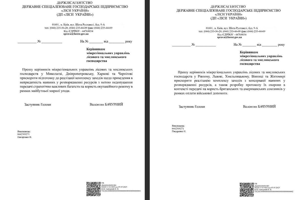 «Прошу руководителей межрегиональных управлений лесных и охотничьих хозяйств в Николаевской, Днепропетровской, Харьковской и Черниговской областях ускорить подготовку для реализации комплекса мер по приведению в непригодность имеющихся в наличии ресурсов с целью недопущения передачи стратегически важных богатств оккупационному режиму в рамках будущей мирной сделки», - написано в одном из документов.