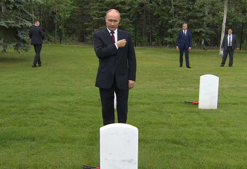 Девять из погибших советских авиаторов похоронены на кладбище Форт Ричардсон. Вот почему, будучи на Аляске, российский президент не преминул там побывать. Путин поочередно возложил цветы к каждому захоронению, преклонив колено и перекрестившись.
