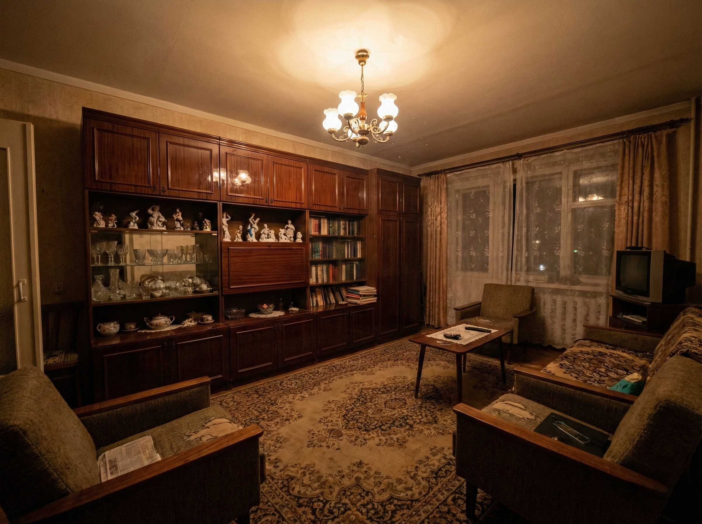 Центральная секция — сервант — работала как домашний музей. За стеклом выставлялось всё лучшее, что удалось «достать»: чешский хрусталь, сервиз «Мадонна» с пастушками, дефицитные книги, которые никто не читал, но все уважали за цвет корешков. Парадокс заключался в том, что этими вещами категорически запрещалось пользоваться.