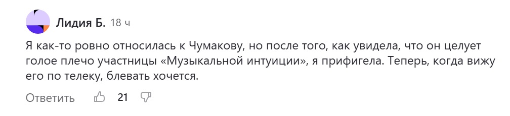 «Я как-то ровно относилась к Чумакову, но после того, как увидела, что он целует голое плечо участницы «Музыкальной интуиции», я прифигела. Теперь, когда вижу его по телеку, блевать хочется», - написала Лидия Б.