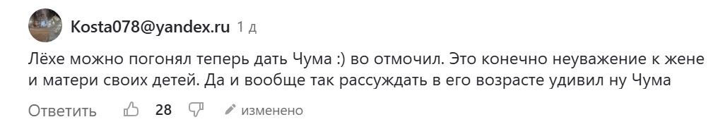 «Лехе можно погоняло теперь дать Чума :) во отмочил. Это конечно неуважение к жене и матери своих детей. Да и вообще так рассуждать в его возрасте, удивил, ну Чума», - отметил пользователь под ником Коста;