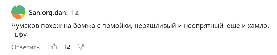 «Чумаков похож на бомжа с помойки, неряшливый и неопрятный, еще и хамло. Тьфу», - считает San.org.dan;