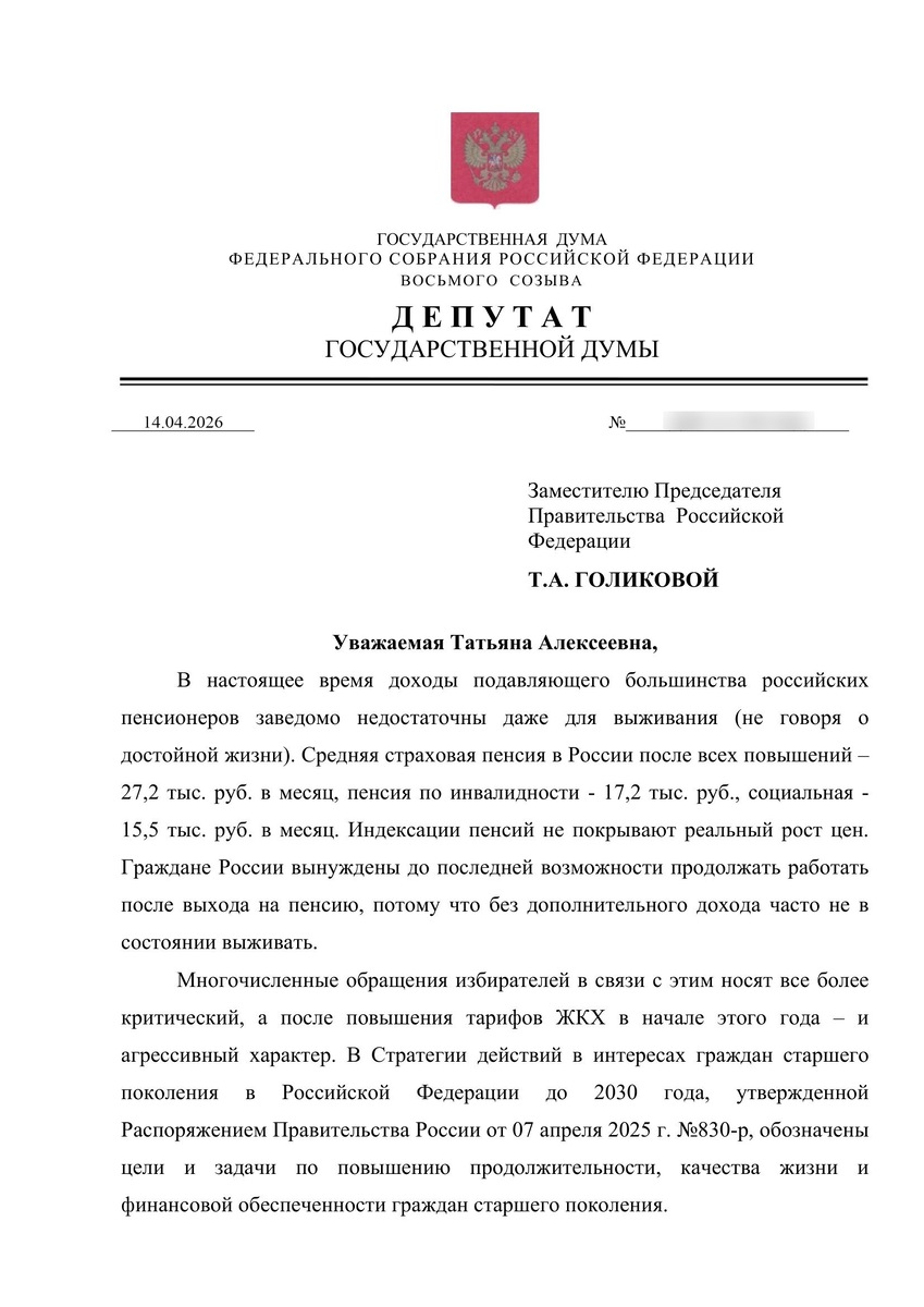 Причём запрос о пенсиях — не единственный. Параллельно депутат направил Голиковой ещё один запрос — о том, что будет с пенсионным возрастом после 2028 года, когда официально завершится нынешняя реформа.