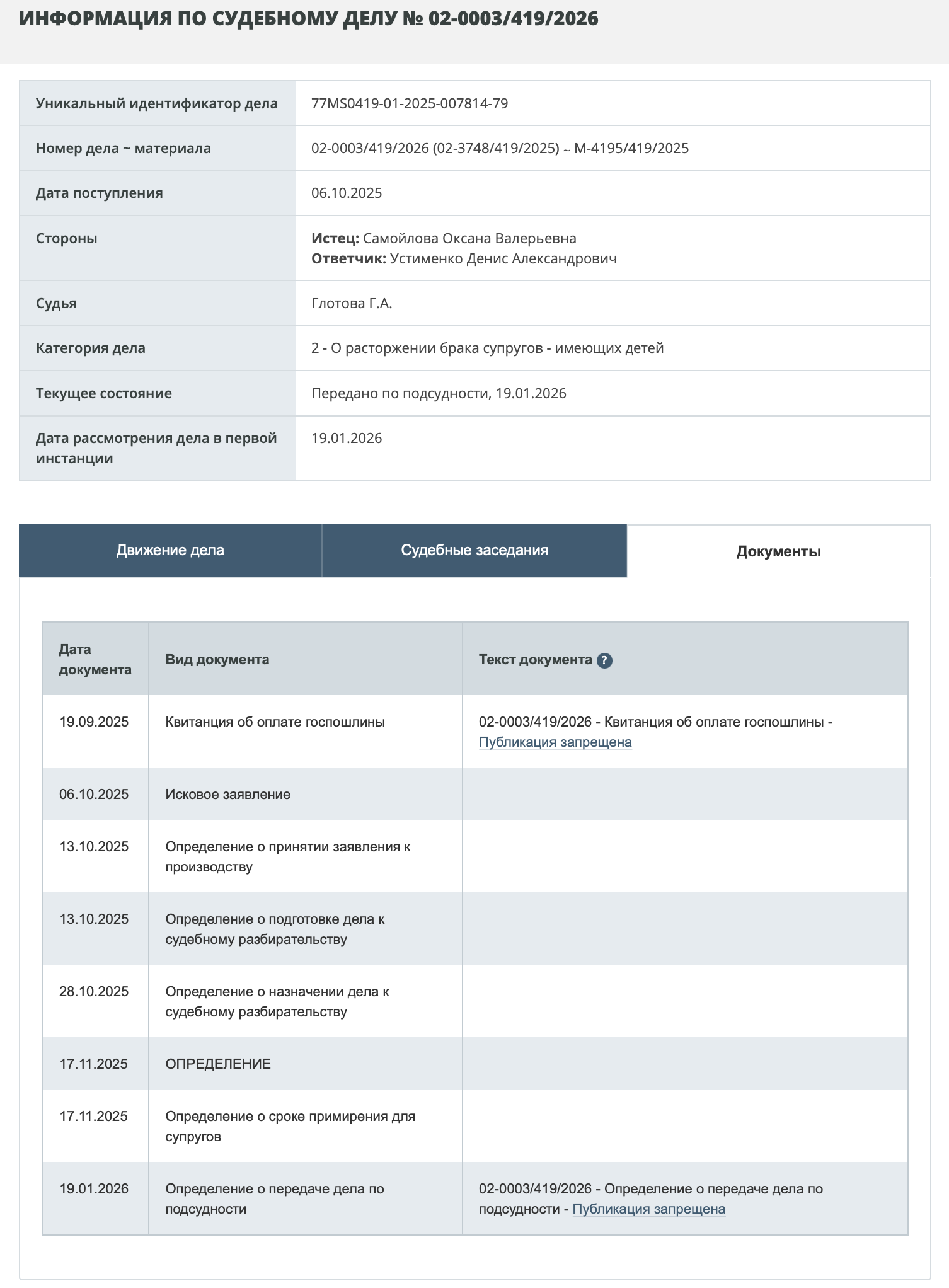 Согласно материалам дела № 02-0003/419/2026, рассматриваемого мировым судьей Глотовой Г.А., процедура расторжения брака запущена необратимо. Иск был зарегистрирован еще в октябре 2025 года. Суд предоставлял паре стандартный срок на примирение, который истек в середине января.