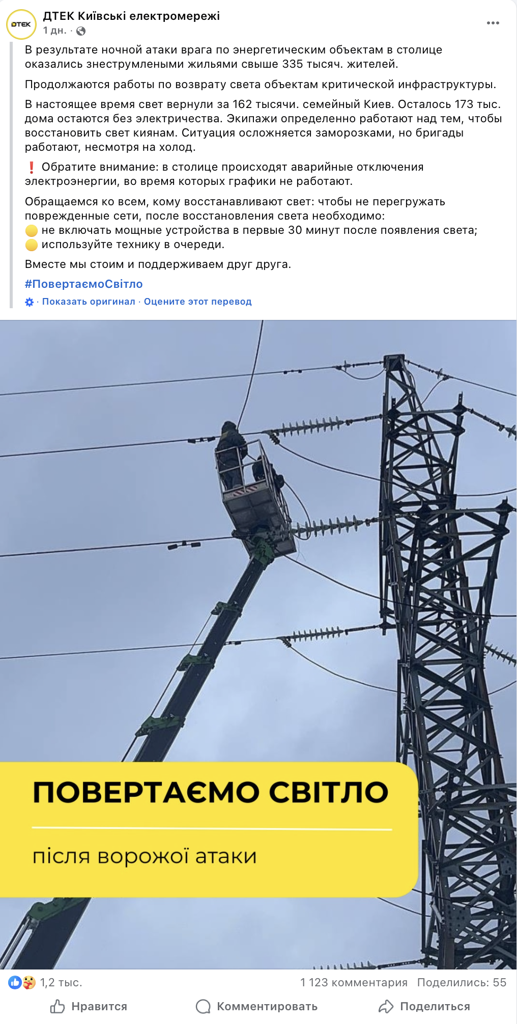 «Мы готовы это терпеть. Мы имели столько страшных испытаний за эти месяцы, столько жертв, столько разрушений, что, честно говоря, блэкаут — это не самое страшное, что с нами может случиться... Больше 90% опрошенных ответили, что они готовы это терпеть два, три года, если они видят перспективу нашего членства в ЕС».