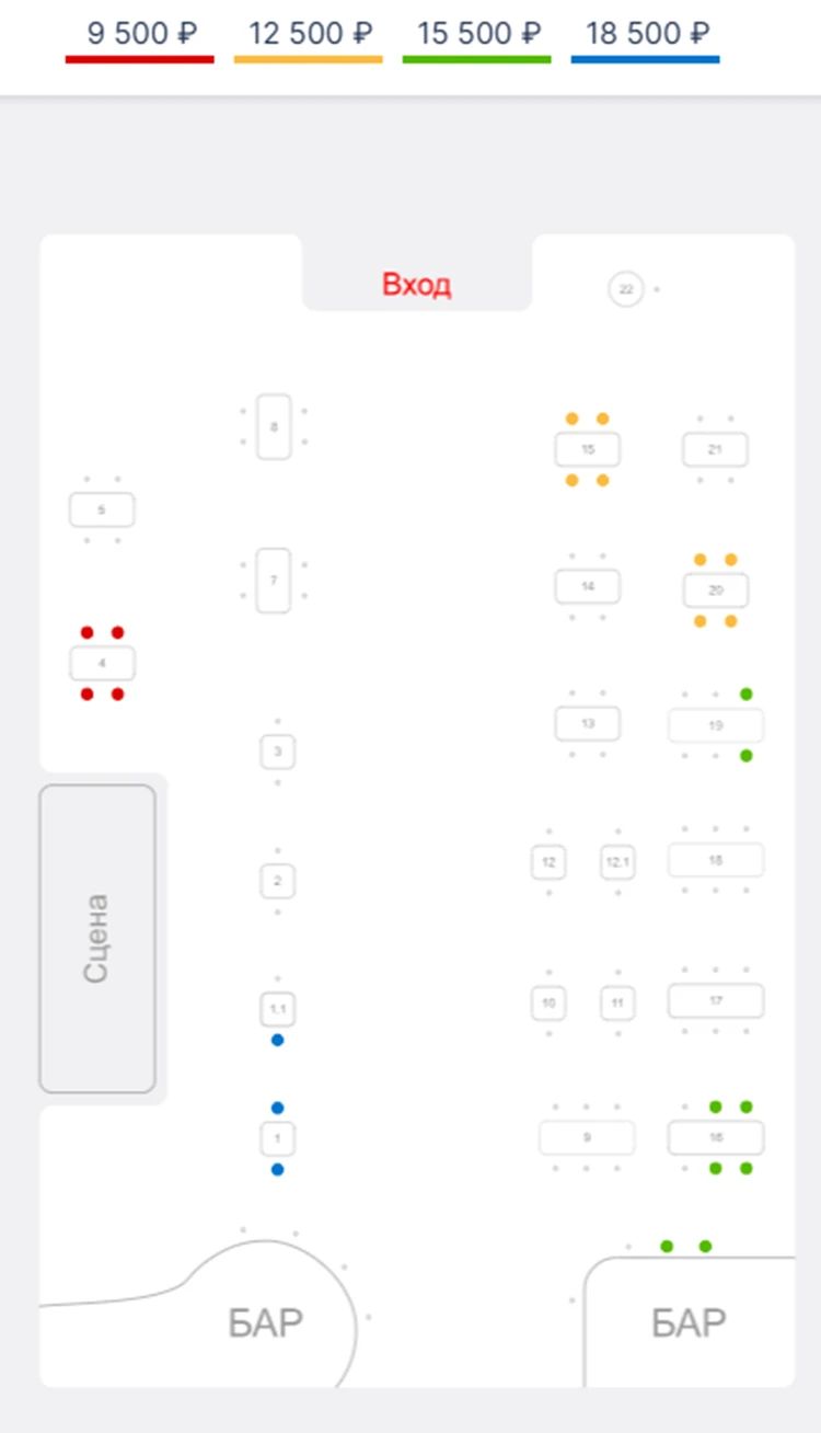Продажи на ближайший концерт Ларисы Долиной в баре: цветным отмечены непроданные места.