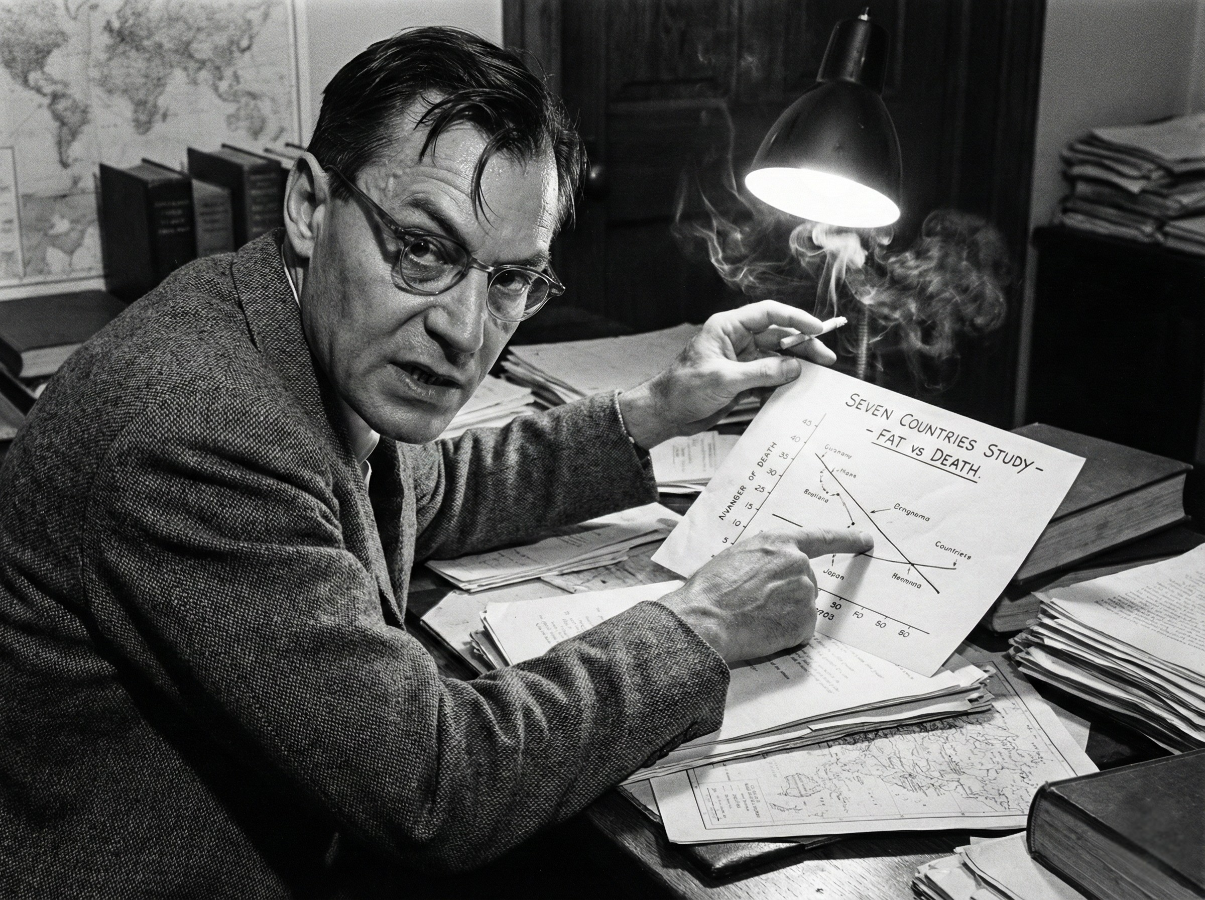 В середине прошлого века физиолог Ансель Киз выдвинул гипотезу: насыщенные жиры повышают холестерин, а тот забивает сосуды. Это стало фундаментом современной кардиологии. Мир покорно пересел на обезжиренный творог и маргарин. Однако критики давно указывали, что Кис "подгонял" факты, исключая из статистики страны, где едят много жирного, но живут долго (например, Францию). Машина была запущена: борьба с липидами превратилась в многомиллиардный бизнес, а любой, кто сомневался в "липидной теории", объявлялся еретиком.