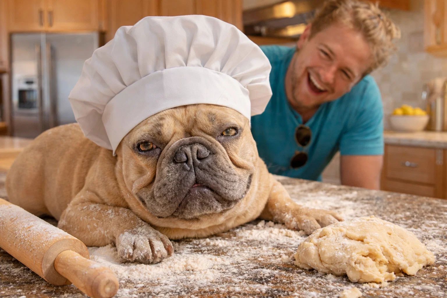 Первое видео, которое выстрелило по-настоящему, было про выпечку. Дункан надел на Тиджея поварской колпак и снял ролик, в котором якобы «замешивает тесто» из своего бульдога — мял, тискал, катал по столу. Пёс смотрел в камеру с видом человека, которому давно всё равно. Именно это сочетание — абсурдная ситуация и абсолютное спокойствие собаки — и зацепило миллионы зрителей.