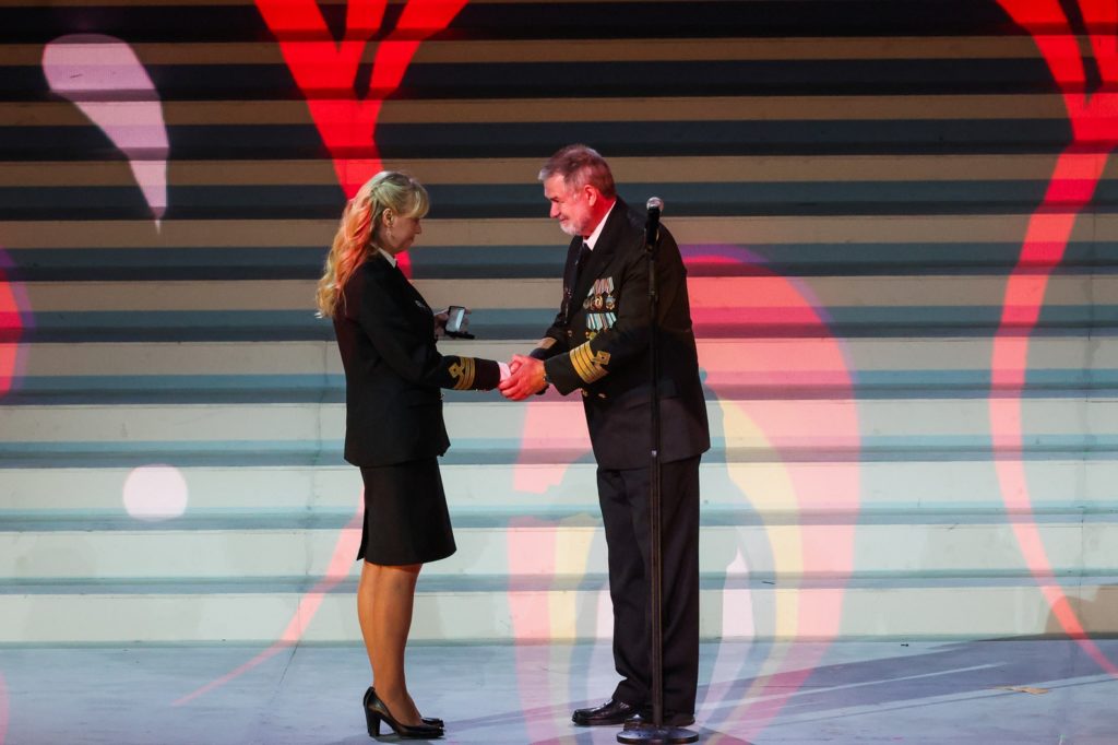На сцене знак капитана Марине Старовойтовой вручает ветеран атомного ледокольного флота Александр Баринов