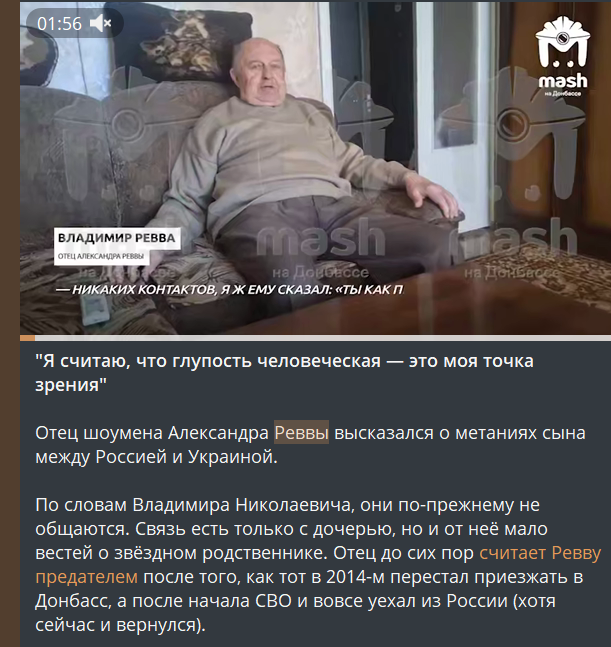 Более того, отец Реввы, Владимир Николаевич, считает сына предателем и утверждает, что сын не потерял связь со своим другом, с которым был близко знаком в связи с игрой в КВН.