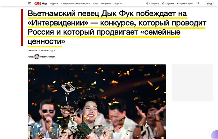 Между тем, например, CNN о «странностях» победителя вообще не пишет, не пытается раздуть скандал и обвинить Россию в лицемерии. Издание с удивлением констатирует, что на конкурсе пропагандируют традиционные ценности.