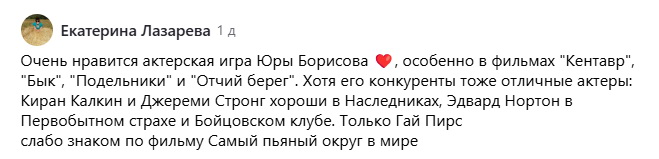 Екатерина Лазарева: «Очень нравится актерская игра Юры Борисова, особенно в фильмах "Кентавр", "Бык", "Подельники" и "Отчий берег". Хотя его конкуренты тоже отличные актеры: Киран Калкин и Джереми Стронг хороши в Наследниках, Эдвард Нортон в Первобытном страхе и Бойцовском клубе. Только Гай Пирс слабо знаком по фильму Самый пьяный округ в мире».