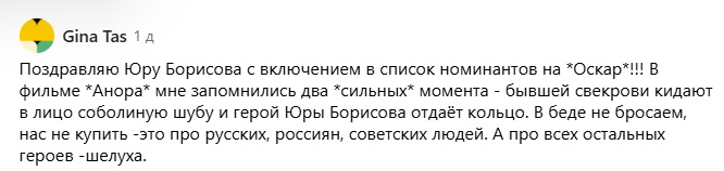 Gina Tas: «Поздравляю Юру Борисова с включением в список номинантов на *Оскар*!!! В фильме *Анора* мне запомнились два *сильных* момента - бывшей свекрови кидают в лицо соболиную шубу и герой Юры Борисова отдаёт кольцо. В беде не бросаем, нас не купить - это про русских, россиян, советских людей. А про всех остальных героев -шелуха».