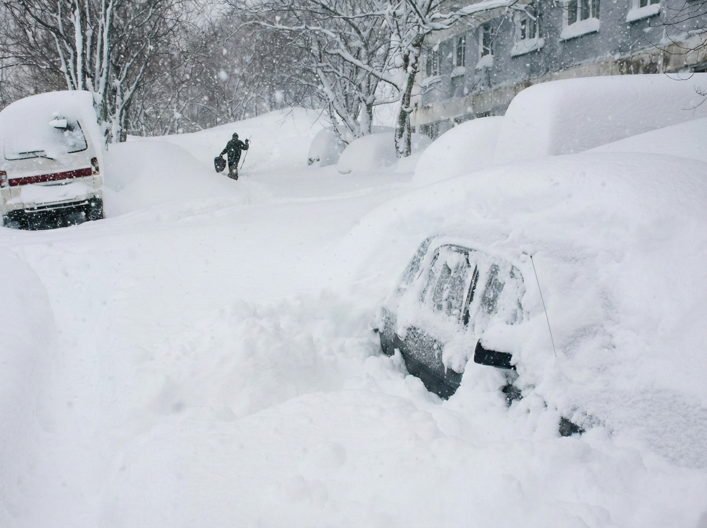 Местные жители подтверждают: город буквально ушел под снег. Те самые вирусные ролики, где джипы превратились в холмики, по которым топчутся пешеходы — не монтаж. Владельцы откапывают свои авто сутками, ориентируясь только на лыжные палки, выставленные как маяки. Но часто и это не спасает: снег идет с такой скоростью, что через три часа метки исчезают.